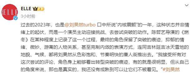 刘昊然《ELLE》采访中回应了观众对《燃冬》 的评论:“我接受所有对这次尝试的评论,角色身上能够看出转型突破的痕迹,有的就是很明显,但从自己的角度来说,那也是真实的,我还没有成熟到可以让它们不被看见。”