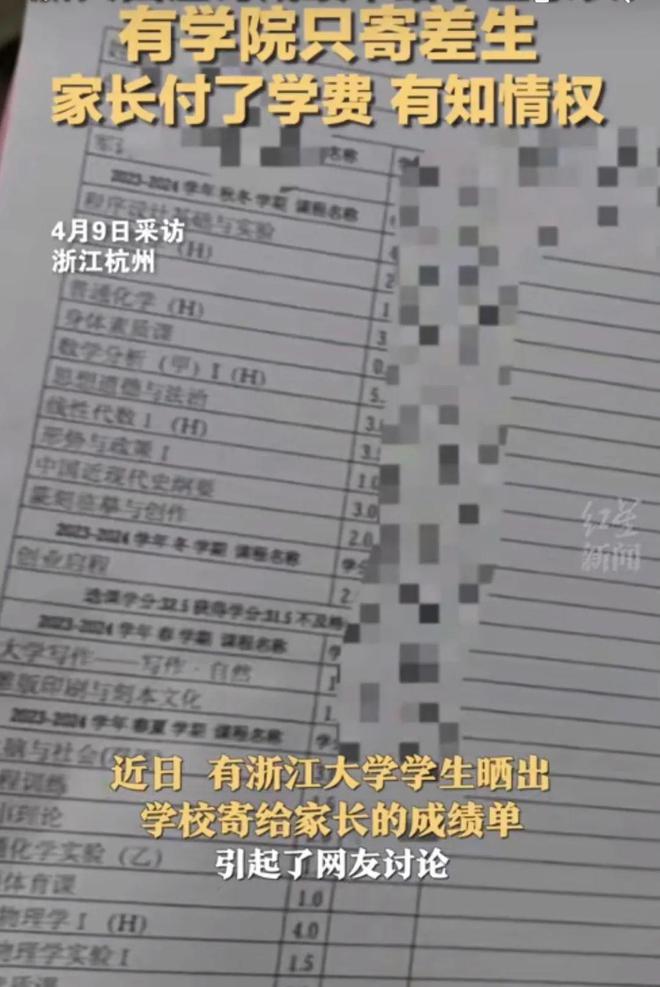 近日,有浙江大学学生晒出学校寄给家长的成绩单,引起了网友讨论。有网友表示,万万没想到读大学了还跟小学生一样担心爸妈看到成绩单。4月9日媒体从浙江大学教务处一老师核实到,部分学院确实会向学生家长邮寄学生在校成绩单。老师说明,此举是为了保障家长的知情权,“虽然学生已经成年,但学费是家长提供的,家长知情权还是需要的”。该老师强调,有些学院不是对每个学生都寄,只针对成绩差的学生邮寄成绩单到家。