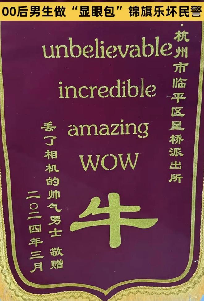 近日,杭州临平区公安分局星桥派出所收到一面“显眼包”锦旗,内容十分“有创意”,署名更是有特色:“丢了相机的帅气男士”,民警看了都差点没绷住。送出锦旗的是一位从事摄影工作的00后男生小马,上个月末,他带着一套价值53000元的相机装备去拍郁金香,拍完却不小心将器材遗落了,于是马上向星桥派出所求助。历经7个小时,在民警的帮助下,小马当天就成功拿回了失而复得的相机。