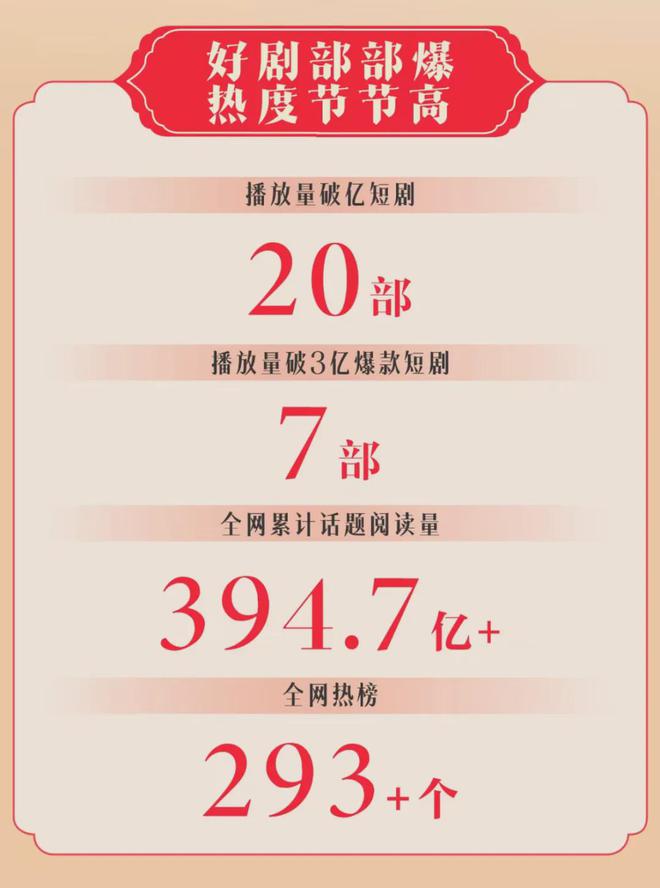 作为最早开始档期化运营短剧的平台,快手在最近的寒假档期间,各项数据再度全面领先:播放量破亿短剧达20部,播放量破3亿爆款短剧7部,全网累计话题阅读量394.7亿+,热搜293个。