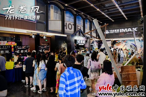 昨日举行的《龙卷风》中国首映活动现场还原了片中的灾后废墟场景,整体布置沉浸感十足。影院外的户外广场上,一辆真实的汽车被“吹翻”在地,路障、轮胎、自行车等或“飞”在空中,或散落遍地;影院内的互动打卡区则特别模拟了龙卷风席卷后的一片狼藉,让观众犹如置身被狂风吞噬的小镇街道,路灯、电线杆倾斜断裂,草垛、衣物及建筑残骸等随处可见。现场更有巨型风扇制造狂风迎面而来,90度倾倒的特制背景还可以让观众模拟出被风暴卷入空中的效果,吸引观众纷纷拍照体验。