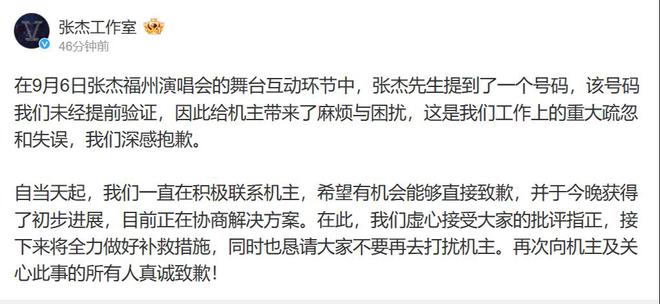 9月9日晚,张杰工作室官方微博发布消息:在9月6日张杰福州演唱会的舞台互动环节中,张杰先生提到了一个号码,该号码我们未经提前验证,因此给机主带来了麻烦与困扰,这是我们工作上的重大疏忽和失误,我们深感抱歉。自当天起,我们一直在积极联系机主,希望有机会能够直接致歉,并于今晚获得了初步进展,目前正在协商解决方案。在此,我们虚心接受大家的批评指正,接下来将全力做好补救措施,同时也恳请大家不要再去打扰机主。再次向机主及关心此事的所有人真诚致歉!