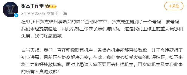 在9月6日张杰福州演唱会的舞台互动环节中,张杰先生提到了一个号码,该号码我们未经提前验证,因此给机主带来了麻烦与困扰,这是我们工作上的重大疏忽和失误,我们深感抱歉。
