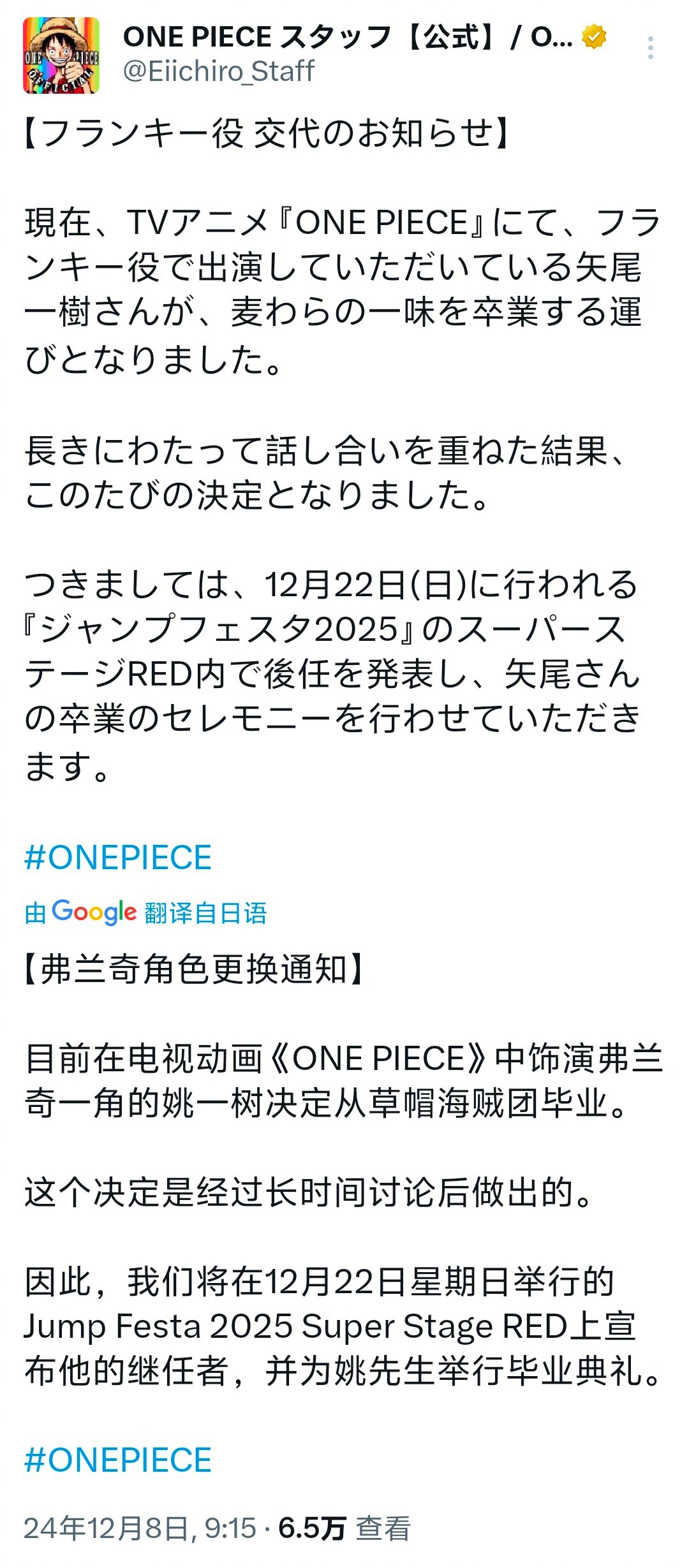 根据官方消息,弗兰奇的声优矢尾一树老师通过与《海贼王》动画剧组方面商议之后做出了退出的决定,2024年12月22日在JUMP FESTA 2025上宣布继任者。