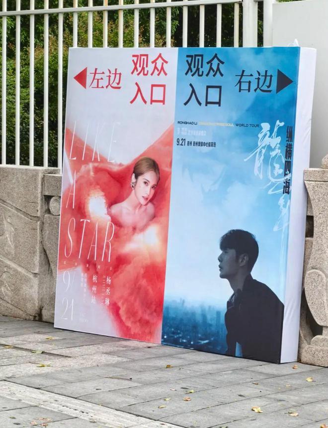 去年九月,两人在杭州同一个场地、同一天开演唱会。门口的入场提示,「贴心」地将两人的海报并排摆放: