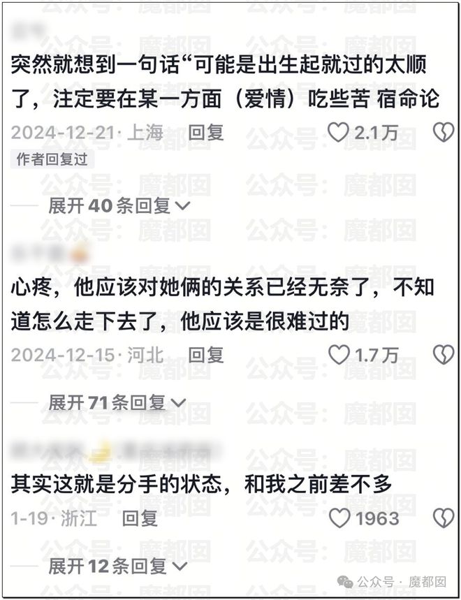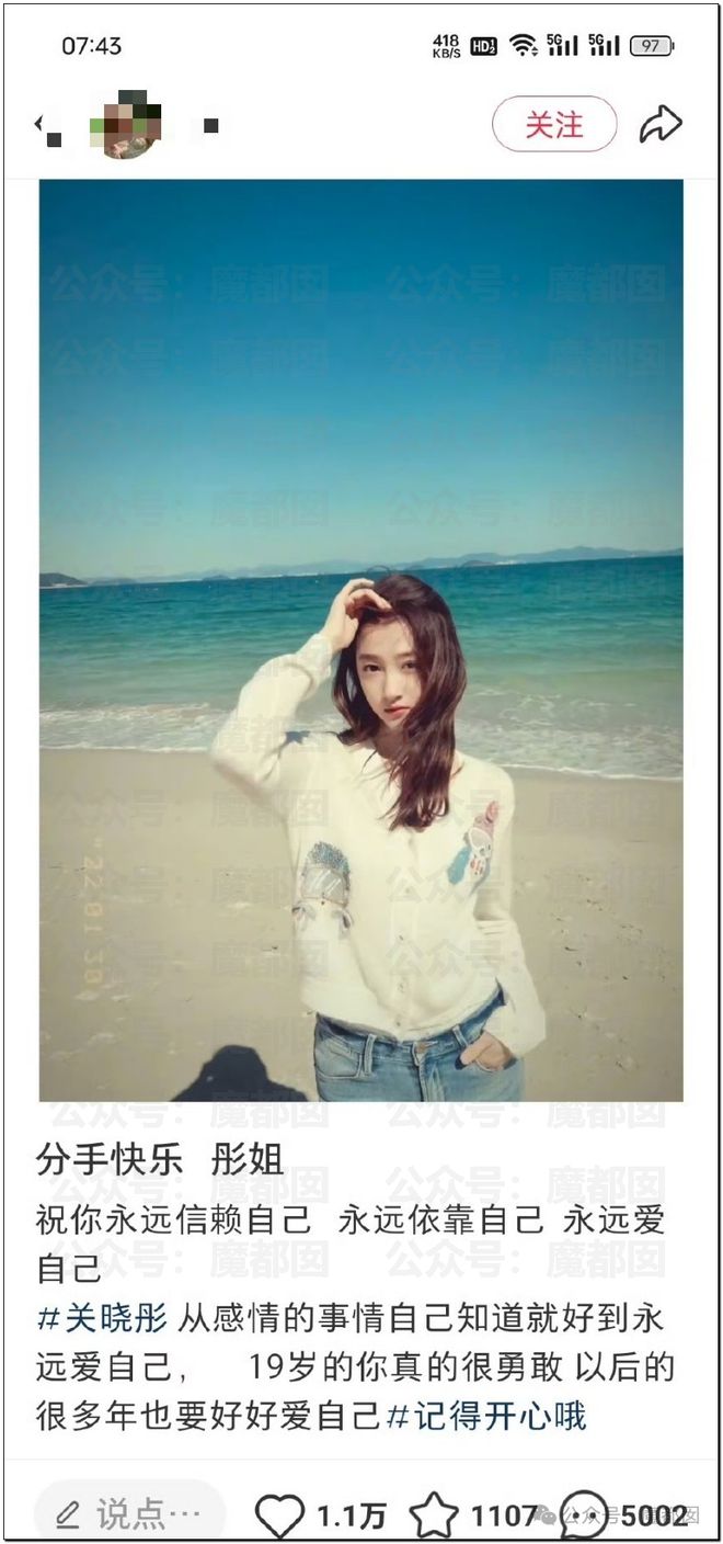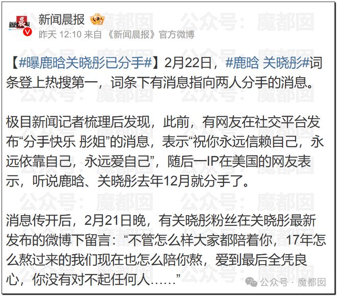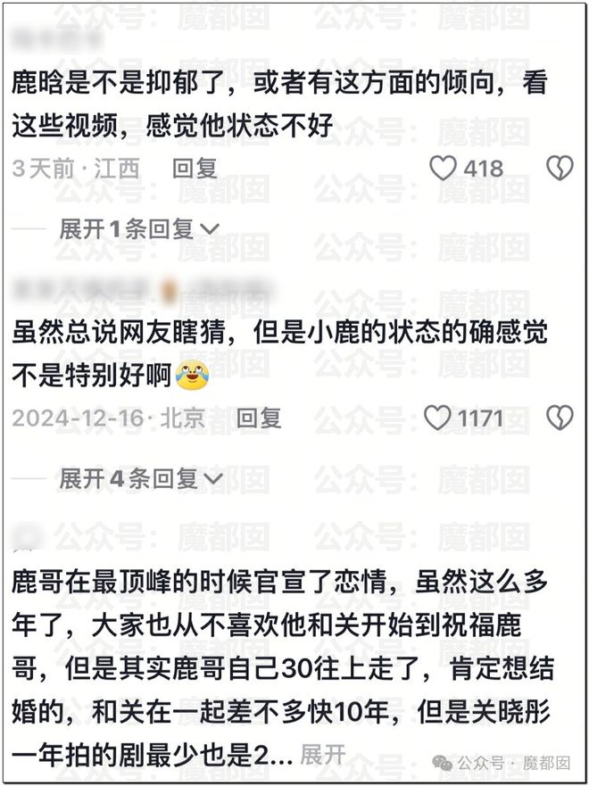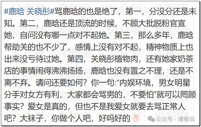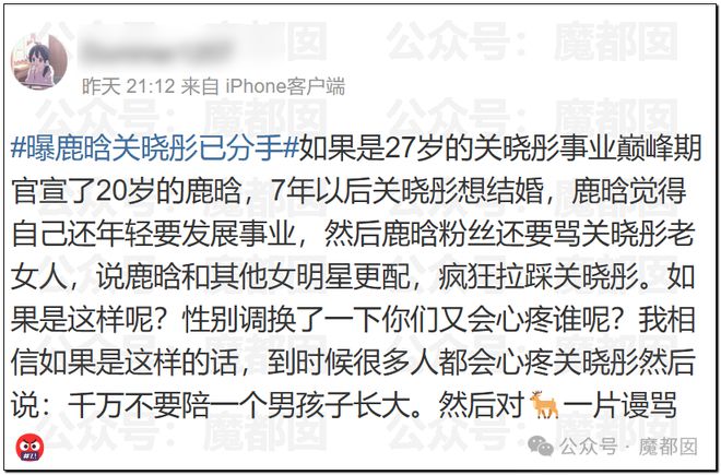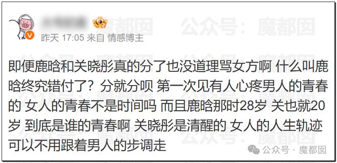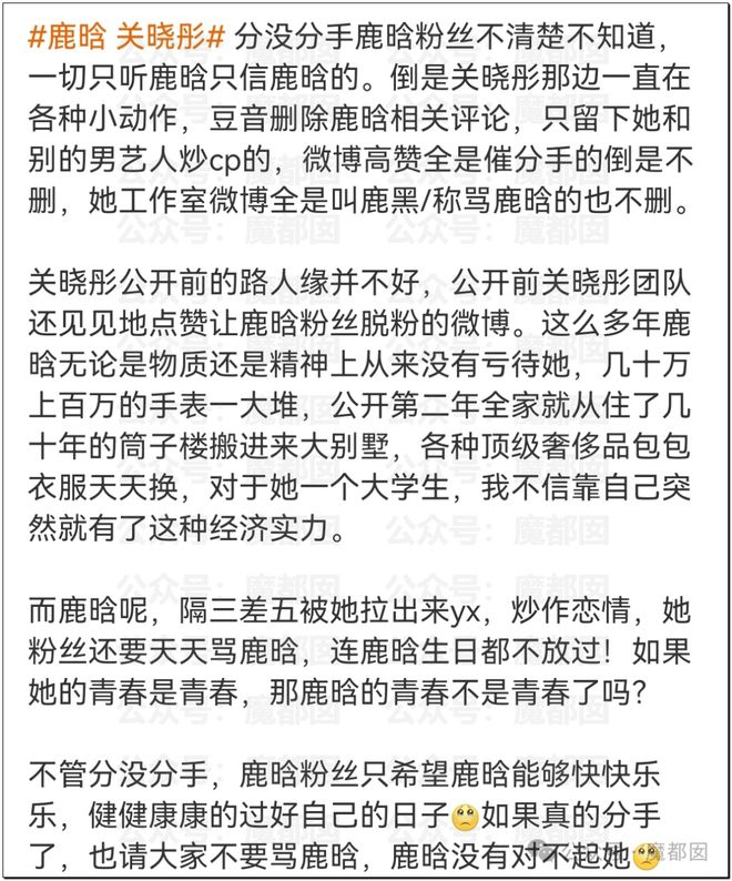 “鹿晗和关晓彤的结局虽然唏嘘,但是似乎也是意料之中。两个人的花期不同,注定走散。鹿晗顶流时期官宣,官宣后完全放弃自己的爱豆红利,近乎于半隐退,关晓彤这两年才真正迎来了自己的事业高峰,而鹿晗已经是个过气偶像了。这个故事告诉我们,无论男女,永远不要恋爱脑,不要陪另一半长大,不要为爱情放弃事业。当别人长大了,见识的世界宽广了,身边出现了更新鲜更有价值的人,谁还记得当初为你背叛全世界的自己有多热烈璀璨。