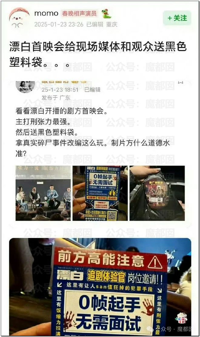 首先,这个《漂白》剧组各种奇葩的操作不断,比如给观众送黑色塑料袋。