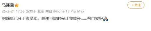 郭品超官宣分手后,马泽涵发文承认:“的确早已分手很多年,感谢那段时光让我成长……各自安好。”