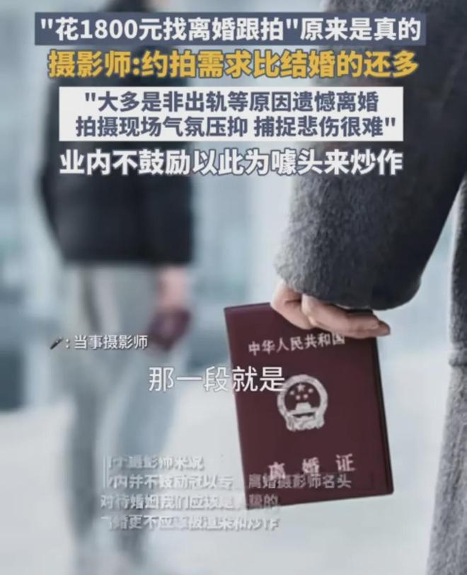 随着人们婚姻观念的转变,离婚话题已不再被避讳。自从摄影师志伟在平台发布第一条离婚约拍视频后,找他离婚约拍的顾客比结婚约拍还要多。今年3月,他要为一对离婚的夫妻跟拍视频,纵使定价1800元,但要抓捕离婚的悲伤却让他压力倍增。虽然离婚跟拍吸引着流量,但志伟称,对顾客来说,离婚不应该被渲染和炒作,找他的顾客离婚大都是遗憾离婚双方抱有着感情。而对于摄影师来说,业内并不鼓励冠以专业离婚摄影师名头。“现场拍摄氛围凝重,接单是希望自己的作品能让夫妻双方看到真实的情感。”