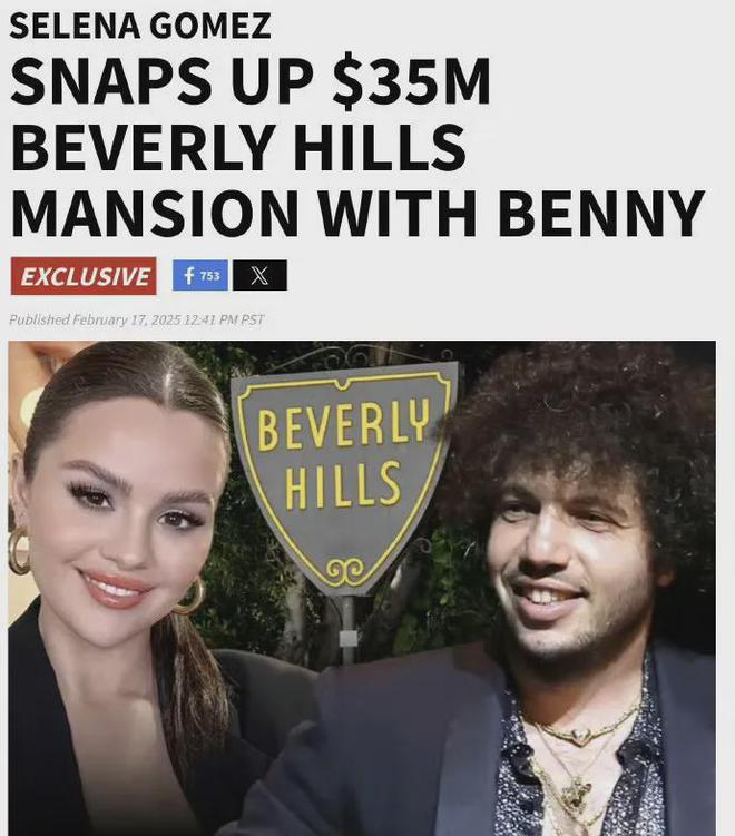 据外媒,赛琳娜Selena Gomez和未婚夫Benny Blanco一起在比佛利山庄买了房子,花费3500万美金。据悉,该房产曾经属于电影《小丑》的导演Todd Phillips,2024年12月时,被赛琳娜和Benny购入。