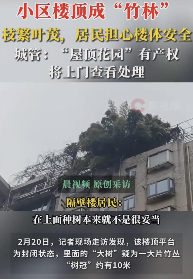 近日,市民反映,长沙华银园小区一栋楼顶种有一棵树,担心其影响楼体安全,希望改进。2月20日,记者现场走访发现,该楼顶平台为封闭状态,里面的“大树”为一大片竹丛,“树冠”约有10米。附近居民表示,该平台有竹丛、树等,存在很多年了,疑似已破坏楼顶,导致楼下住户家中渗水。2月20日,雨花区城管执法大队队员告诉记者,经初步了解,该平台为某住户拥有产权的屋顶花园,如果该植被影响了楼体安全,相关部门会要求其整改。目前住户不在家平台封闭,下一步会联系住户,进入平台详细了解。