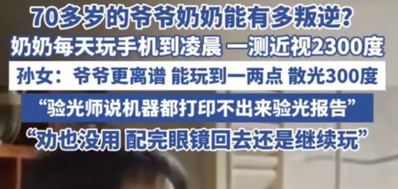 2月20日(报道),山东菏泽,70多岁奶奶每天玩手机到凌晨,一测近视2300度。孙女称爷爷奶奶每天睁开眼就是玩手机,一直玩到深夜,家人劝也劝不动,机器都打不出验光结果。