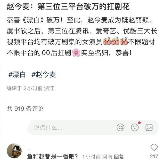 有人称她是第三位三平台破万的抗剧花,但评论区里质疑声不断,原因就是其他两位是一番,而她并非如此。