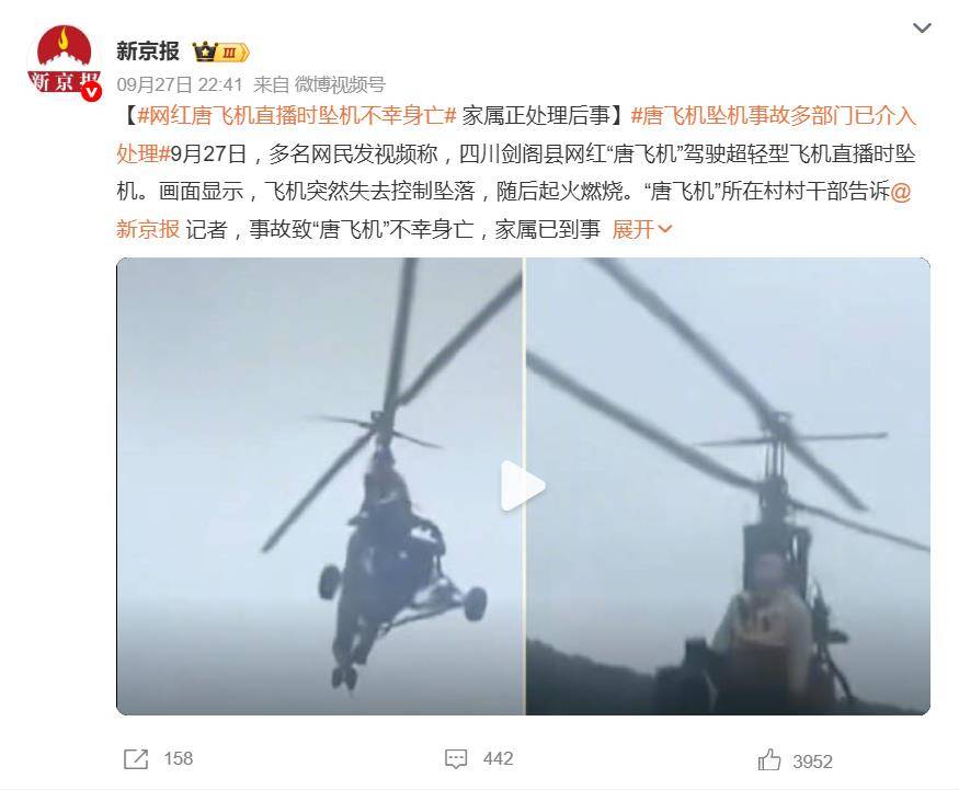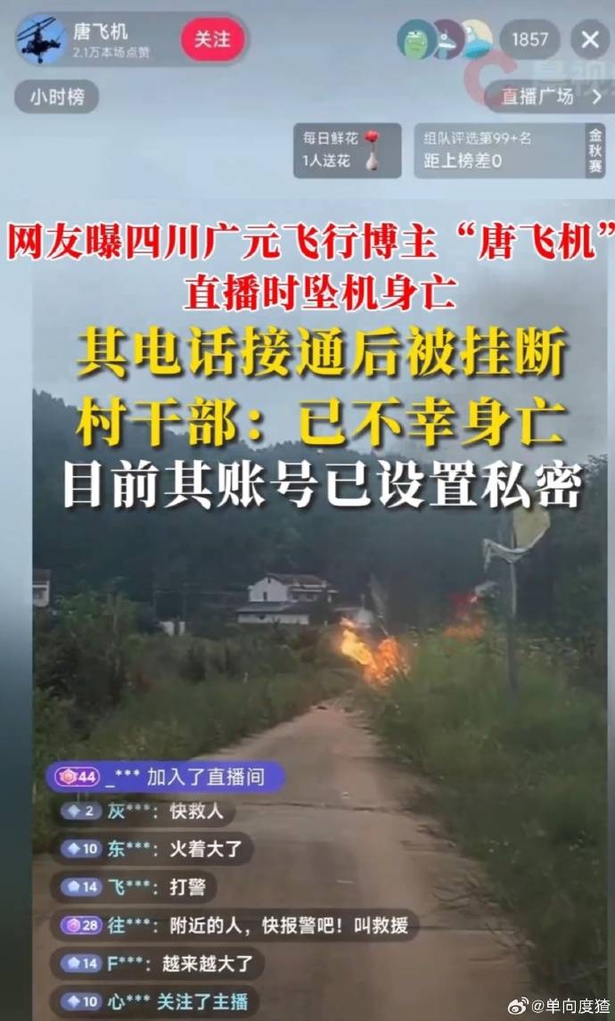 这场事故最残酷之处在于其“全程直播”的性质。千余名观众在直播中实时目睹了一个生命的陨落,从惊呼到绝望的弹幕,成了这场悲剧最真实的注脚。有网友痛心道:“这是用生命的代价做最后一场直播。”更多素不相识的人则表示震惊与惋惜:“第一次刷到他的视频,就听说坠机了……祝安息。”