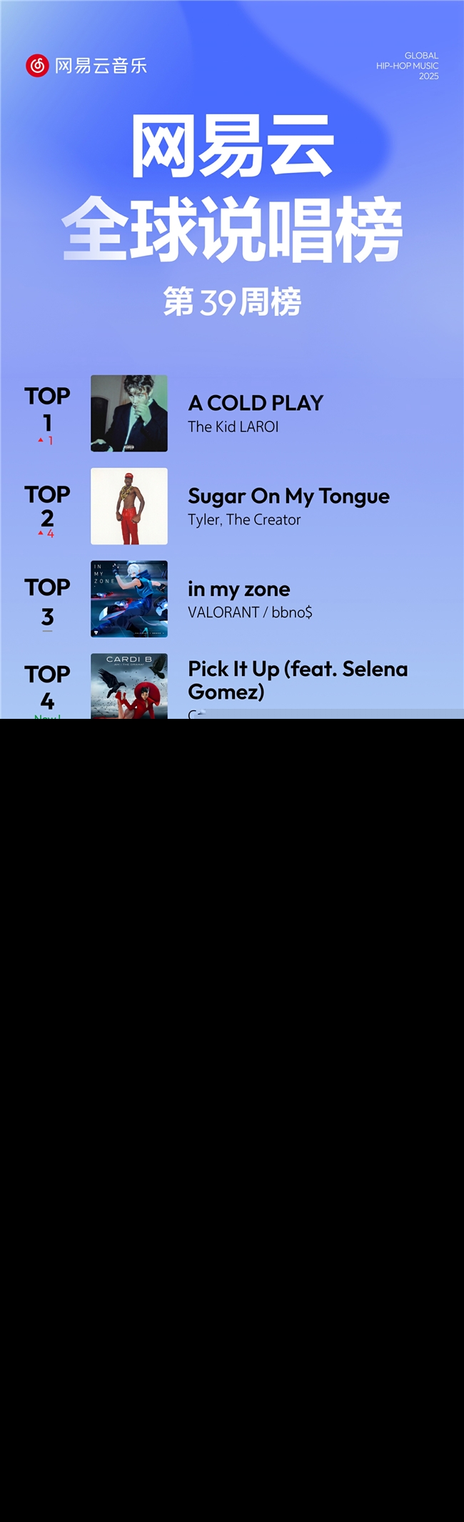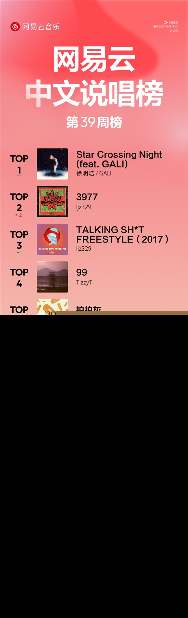 9月26日,网易云音乐发布2025年第39期说唱周榜。中文说唱榜方面,徐明浩与GALI的合作歌曲《Star Crossing Night》蝉联本周中文说唱榜榜首。Top Barry在《新说唱2025》中演唱的《Can’t go back (Live)》以及艾热 AIR、SHarK合作的《千疮百孔》热度回升,重返榜单前十,分别位列榜单第七和第九。同时,TizzyT《99》、脏饼干《拍拍灰》持续位居榜单前五。加木近期连发多首新歌,与K.Zoom钟麒合作的《1V1》本周保持第八位。此外,他于9月20日发布新专《嵌入生长》,专辑中与马赫mood合作的《好坏》首次进入榜单便位居第十七位。