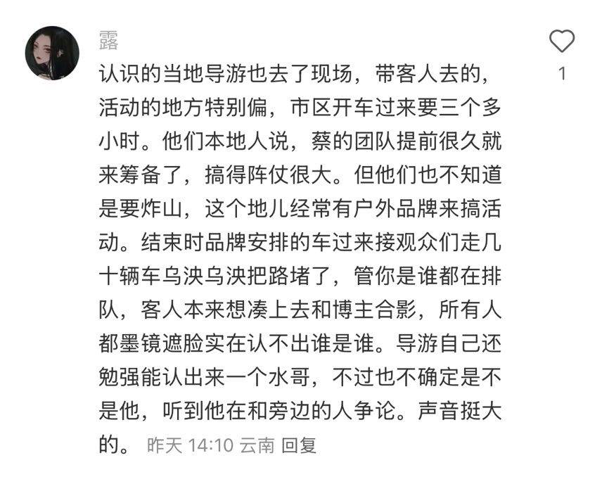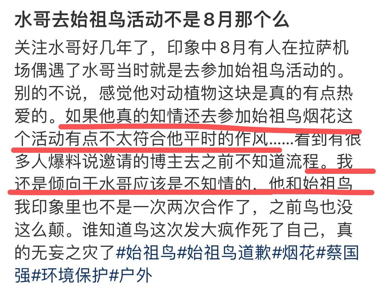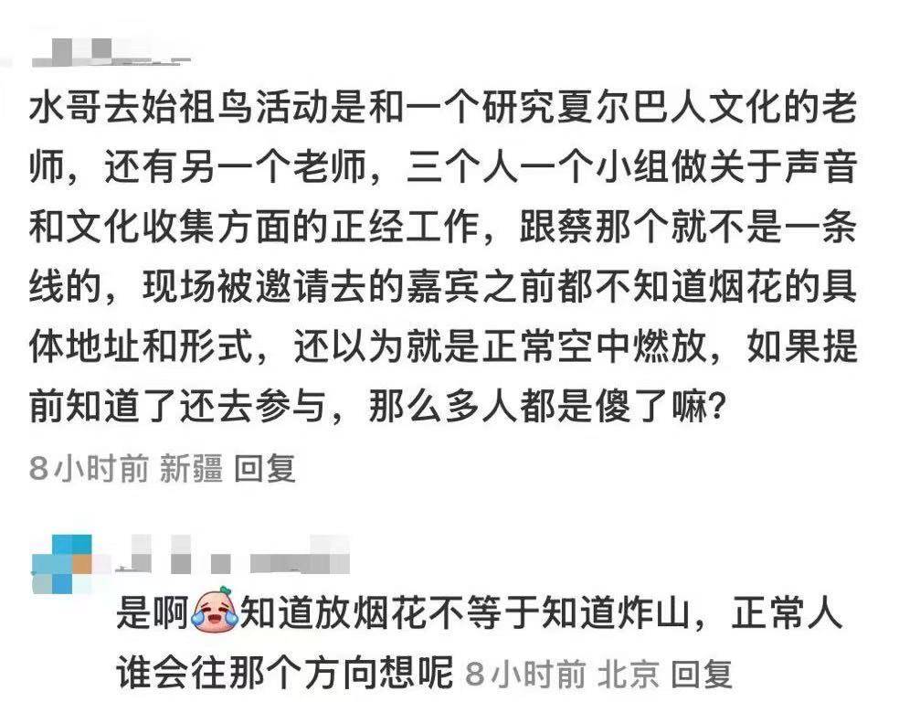 网上还有人称水哥是因为之前参加了始祖鸟夏尔巴文化采风活动,这次在烟花现场估计是跟其他博主一样被“坑”了。