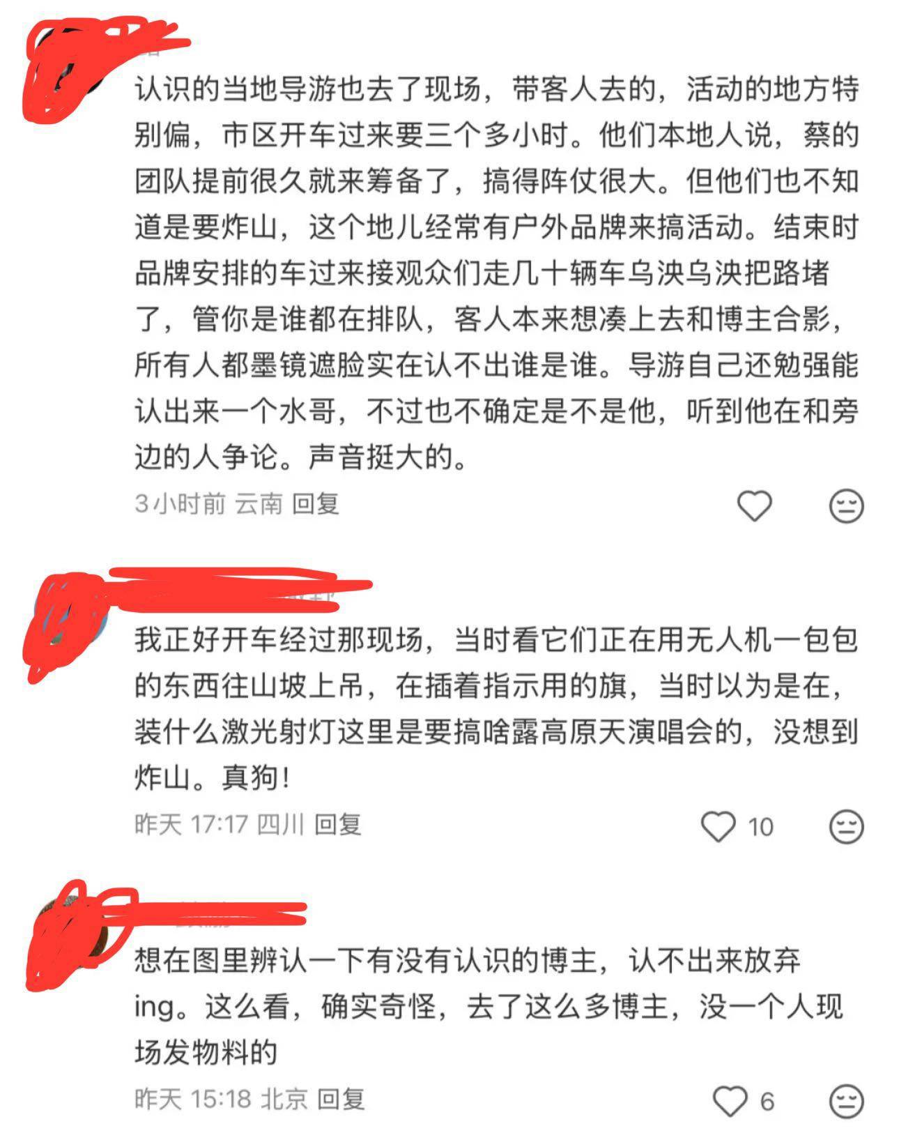 而复盘整个事件发现,水哥疑似被“坑”。据知情网友表示:品牌邀请时说的是活动【具体】内容保密,但会有神秘惊喜。谁知这个神秘惊喜就是炸山放烟花!事情发生后就有好几个 kol 现场和品牌方吵起来了,怪不得【几百个kol去了没几个】发现场图。