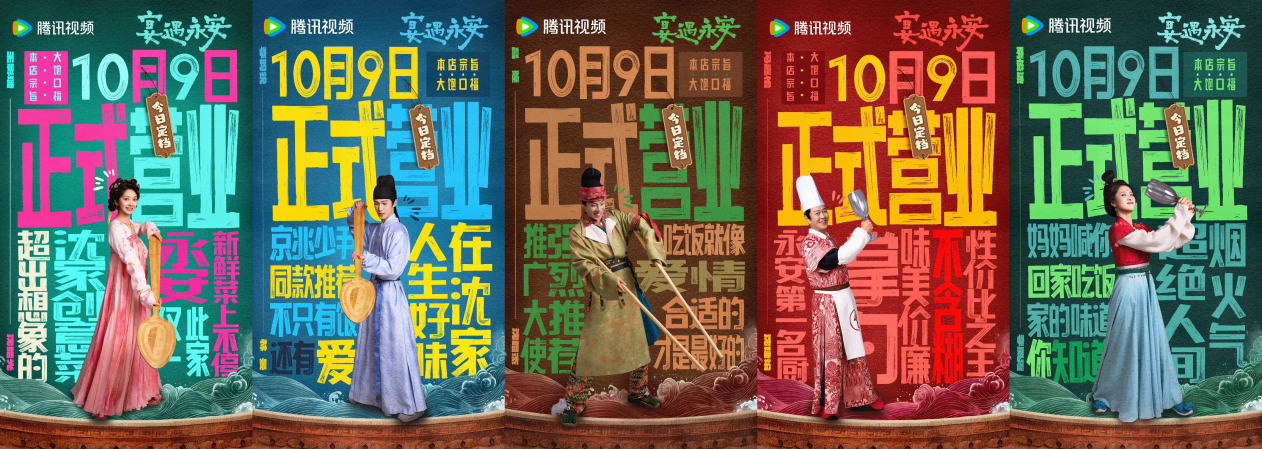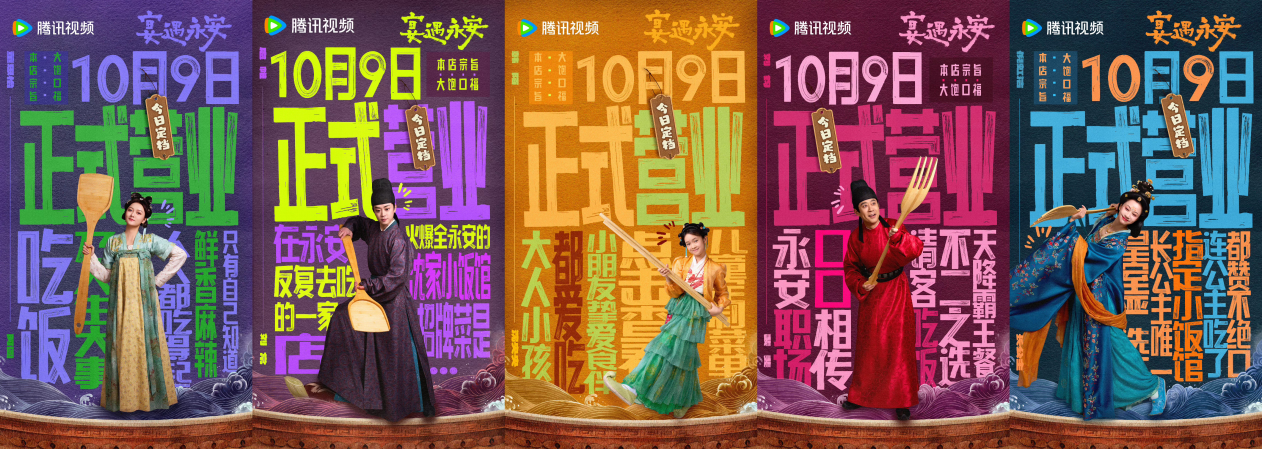 今日还另外释出一组主题海报,海报以巨型餐具为核心视觉亮点,涵盖勺子、筷子、酒杯、铲子、叉子五种样式。十位主演分别手持餐具,摆出举勺、夹菜、拎铲等趣味十足的俏皮姿态,灵动神态间满是鲜活气息。海报整体配色鲜艳明快,人物背景处融入超大弹幕元素,展示出沈家小饭馆10月9日开业主题的网感宣传语。这些丰富的趣味细节,传递出剧集轻松诙谐的核心调性。