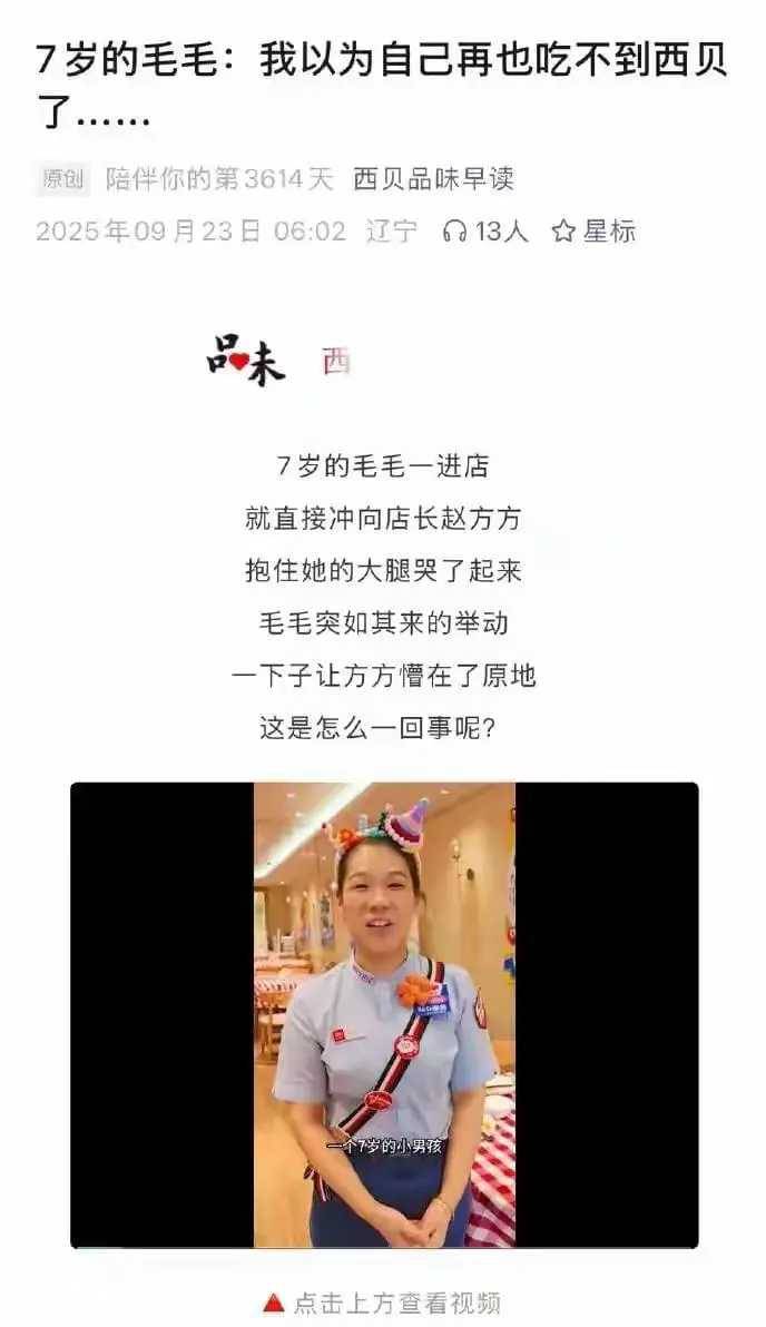 先是有“铁粉不吃饭也要充值1000元”“年轻人喊出与西贝同生死”等被指脱离现实的情节,后有《七岁的毛毛》——讲述七岁男孩因母亲不让吃西贝当场大哭,抱住店长大腿哀求“西贝别关门”——被网友质疑“七岁孩子如何抱住成年店长大腿?”