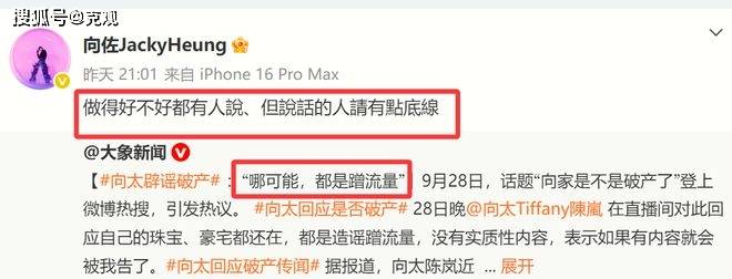 因为向太向佐转战互联网领域,向佐更是为了热度不惜多次穿女装上阵,因此有网友猜测向家破产了,所以母子俩才如此卖力赚钱。对此,向太辟谣了破产传闻,向佐也喊话造谣者要有底线。