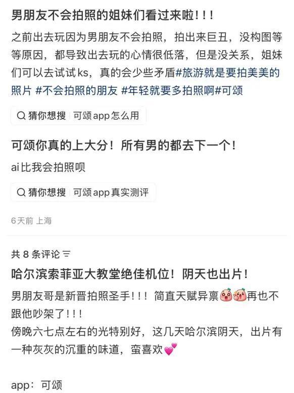 拿可颂举例,这些广告内容往往会通过几张照片或一段视频向大家推荐某一地点的拍照姿势和拍摄角度,并告诉用户如何在可颂找到不同地点的最佳机位攻略,由此吸引用户下载和使用。