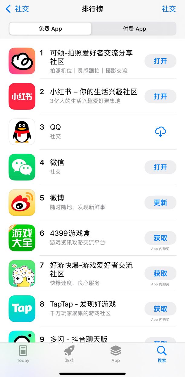 今年4月开始,可颂的下载量已经连续四个月位居社交类第一名,一度超过了此前稳居榜首的小红书。截至发稿前,可颂仍在社交免费app榜首。