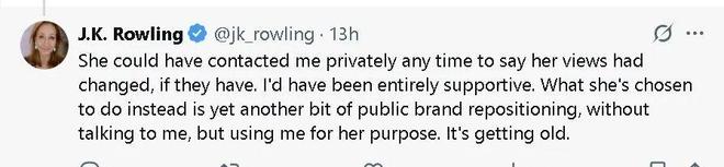 罗琳在回复评论时再次抨击艾玛沃特森:“如果她的观点真的改变了,她随时都可以私下联系我,告诉我,我会全力支持。但她现在的做法,只是又一次公开重塑个人形象,既不与我沟通,却又利用我来达到她的目的。这种把戏真够老套的。”