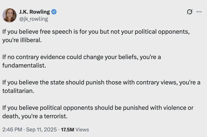 罗琳当然是哈利波特最好的代言人,因为她根本就是哈利波特的缔造者,她勇敢,坚定,对人性有着深刻的洞见。这几年她一直被极左小将们攻击,但从来没有屈服过,她一直在坚持自己的理念,一直保持着强烈的爱憎,她从来不惮于说出自己的立场,敢爱敢恨,战斗力爆棚。罗琳在查理柯克被刺后,曾经说过这样几句话;“如果你认为言论自由只属于你而不属于你的政治对手,你就是虚假的自由主义者。如果相反的证据也不能改变你的信念,你就是原教旨主义者。如果你认为国家应该惩罚持不同意见的人,你就是极权主义者。如果你认为政治对手应当受到暴力甚至死亡的惩罚,你就是恐怖分子。”