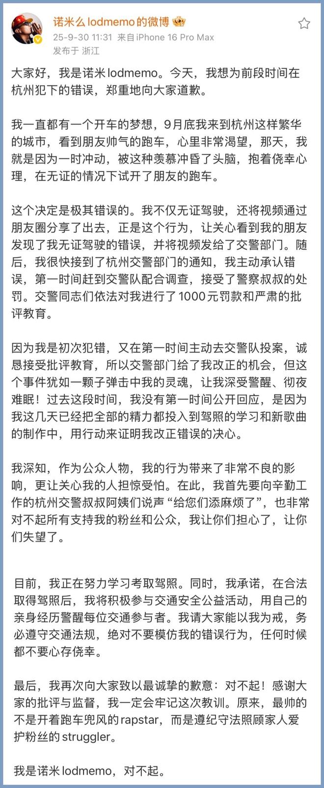 “对不起!感谢大家的批评与监督,我一定会牢记这次教训。原来,最帅的不是开着跑车兜风的rapstar,而是遵纪守法照顾家人爱护粉丝的struggler”