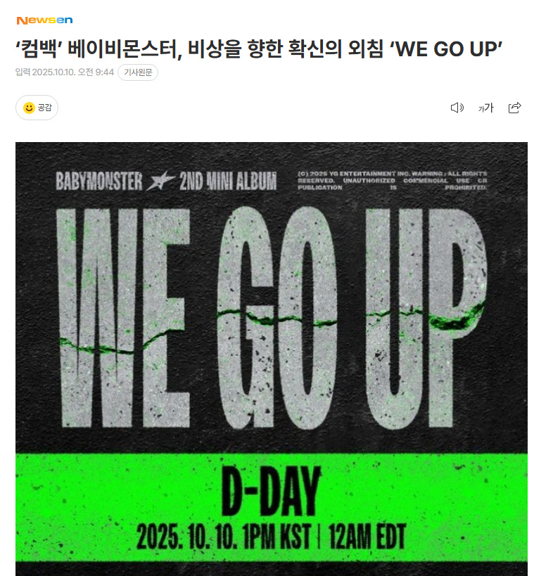 据韩媒消息,人气女团BABYMONSTER将于今日下午1点(韩国时间)以迷你二辑《WE GO UP》回归。