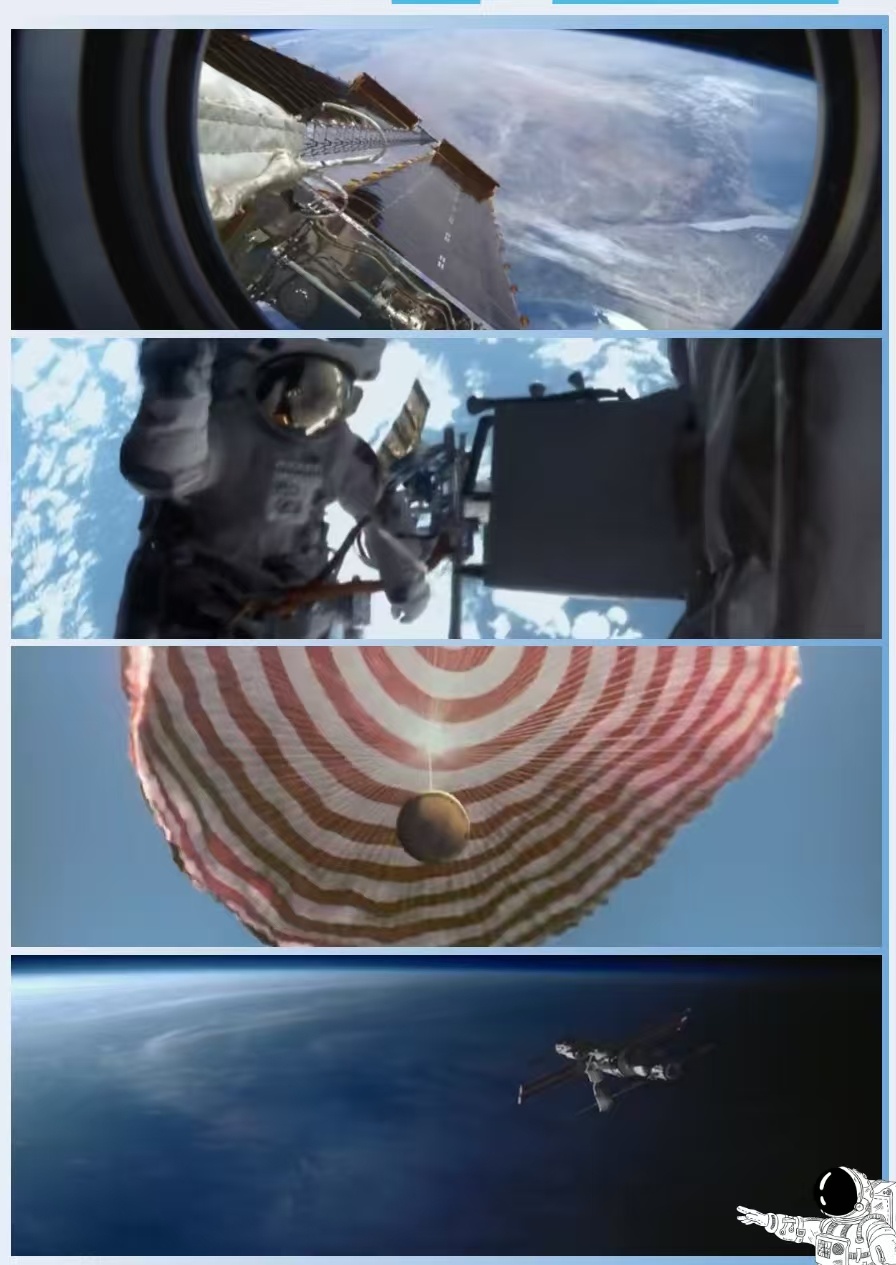 航天员们用日常视野,关注着太空舱、空间站、太空和地球;故意压低的仿佛太空回响般的音乐旋律,飘飘荡荡、点点滴滴,衬托出广袤宇宙无限的延伸……