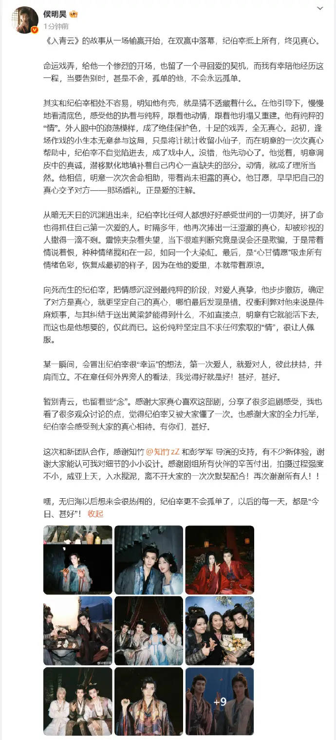 侯明昊发文称:“《入青云》的故事从一场输赢开始,在双赢中落幕,纪伯宰抵上所有,终见真心。