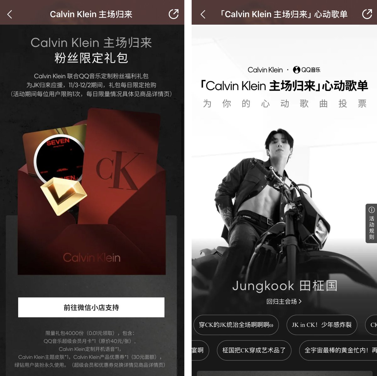 近日,QQ音乐与全球知名品牌Calvin Klein(以下简称为CK)合作,发起田柾国回归粉丝应援活动。不仅推出田柾国限时装扮、应援互动活动,还特别推出粉丝限定礼包,为粉丝带来独具收藏价值的数字体验。这一跨界合作将音乐与时尚跨界融合,活动一上线便引发互动和抢购热潮。