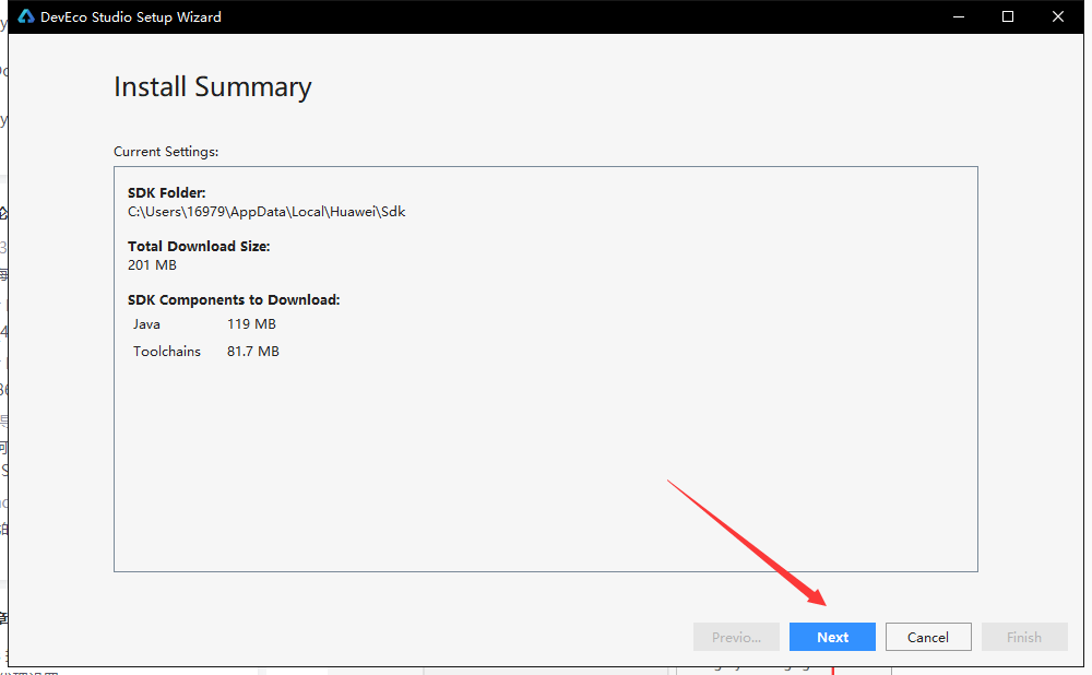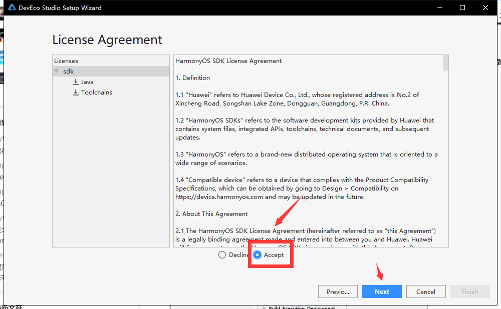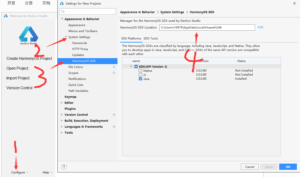 继续等等,这里看了一下官网API,这一步是首次下载HarmonyOS SDK时,只会默认下载JavaSDK和Toolchains,如果你需要别的JS或者C/C++语言开发的话需要自己手动下载对应的SDK哦