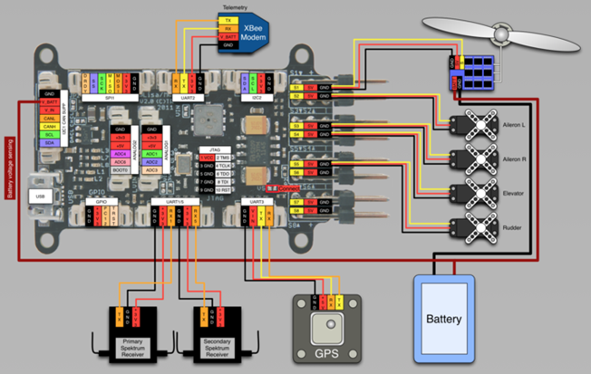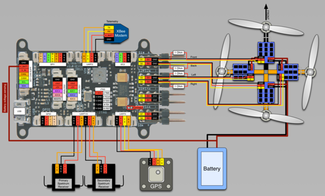 电池与经过四路分别于四个电调相连接,电调包含 3PIN 信号线自带的 5V 输出连接到主板伺服 1、 2、 3、 4 为主板供电,同时电调的另一端输出为电机供电。电池电压可以通过将电池的正极引出一根线至主板的 V_BAT 接口。数传电台 XBee 接入主板的 UART2,也可以用更为廉价的 3DR 数传代替。GPS 模块接入 UART3,支持 UBX 协议、 NEMA 协议的 GPS。遥控器接收机与 UART1/5 相连,也可以用含有 PPM 编码的接收机通过伺服 6 与主板相连。