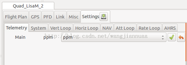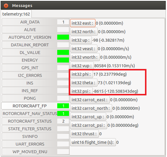 由于飞控安装到载机上不可能严格保证其处于水平位置,换句话说,安装完好的载机放置在地面上,通过地面站观察到的陀螺仪不能严格保证水平。带来的后果是飞机起飞后姿态漂移。校准方法是在Paparazzi Ceneter的Settings添加body_to_imu.xml,然后编译、上传、并打开地面站,此时在地面站的Settings模块会多出body2imu的选项,打开messages,找到水平分量theta、phi(图中以四轴为例)。此时通过调整b2i phi、b2i theta,使得messages中的phi、theta为0即可,记录下此时的参数,写入机体配置文件。