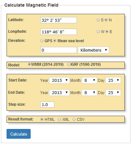 打开网站:http://www.ngdc.noaa.gov/geomag-web/#igrfwmm,输入当地经纬度(南京为例):