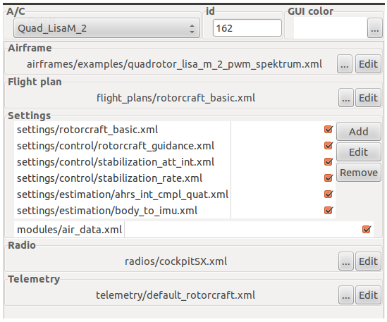 以Lisa/M v2.0为例:固定翼机A/C选择Microjet_LisaM,默认体配置文件为microjet_lisa_m.xml;四轴的A/C选择Quad_LisaM_2,默认机体配置文件为_lisa_m_2_pwm_spektrum.xml。下面点击编辑,文件内容有很多,我们关心的几个核心的配置(必须掌握) :